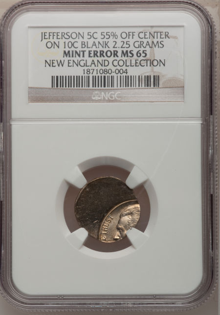 Undated Jefferson Nickel--Struck 55% Off-Center on a Clad Dime Planchet--MS65 NGC