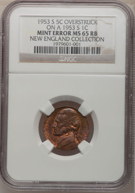 1953-S Jefferson Nickel--Struck over a 1953-S Lincoln Cent--MS65 Red and Brown NGC