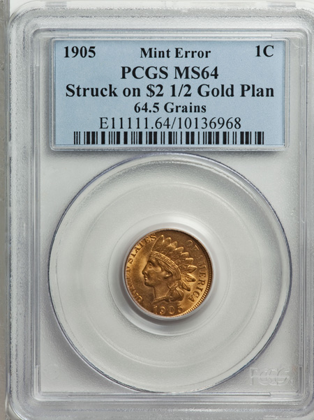 1905 Indian Cent--Struck on a Quarter Eagle Planchet--MS64 PCGS