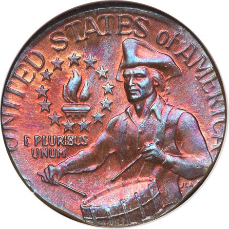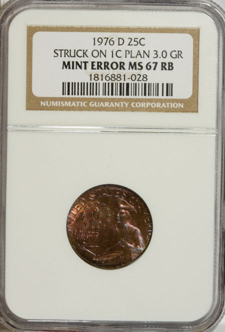 1976-D Bicentennial Quarter--Struck on a Cent Planchet--MS67 Red and Brown NGC