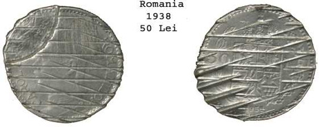 The two Romanian coins featured below had all the ear-marks of being mint errors (partial brockages). Obviously the coins had been defaced. My assumption was that the heavy lines were the result of the Mint destruction of mis-struck coins.