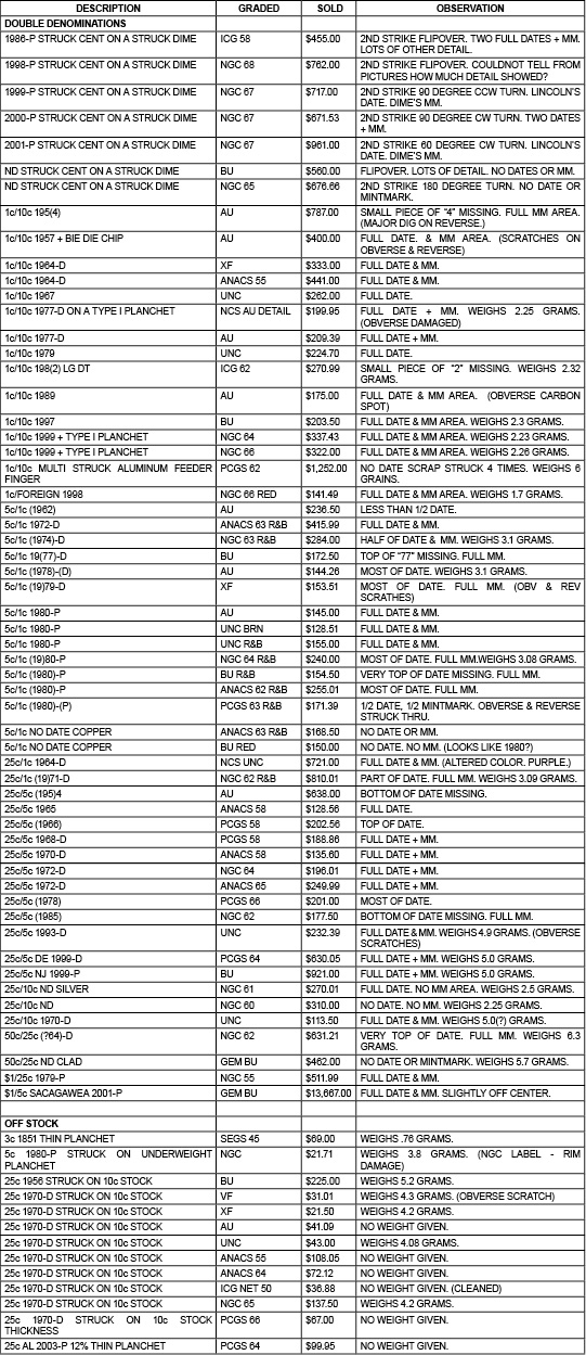 Below are records of recent sales of double denomination and off-metal mint errors on eBay from 10/01/08 to 12/31/08.