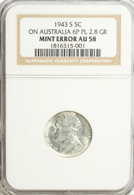 1943-S Jefferson Nickel--Struck on an Australian Sixpence Planchet--AU58 NGC
