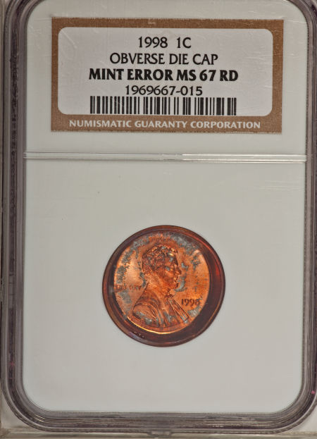1998 Lincoln Cent--Obverse Die Cap--MS67 Red NGC