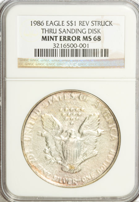 1986 Silver Eagle--Reverse Struck Through Sanding Disk--MS68 NGC