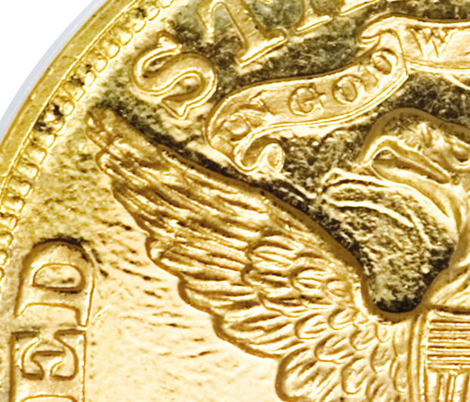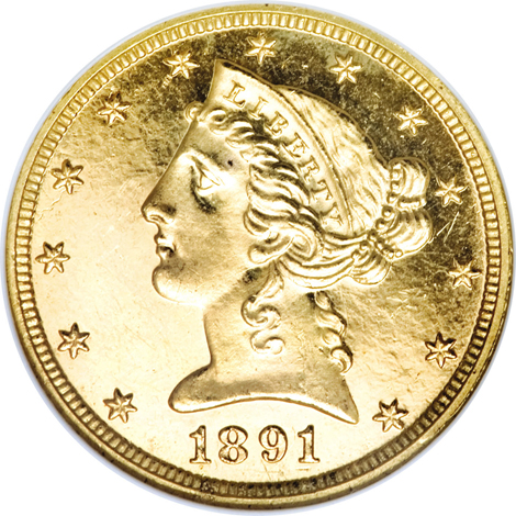 1891 $5 --Triple Struck with Reverse Rotation--PR64 Ultra Cameo NGC. This rare proof half eagle was struck at least three times by the dies. Of course, all proof Liberty fives were multiple struck, to bring out complete definition. What makes the present piece an error is that the hammer (reverse) die was apparently loose, and rotated a couple of degrees between strikes. The anvil (obverse) was stationary. As a result, the obverse shows no evidence of a multiple strike, but the reverse has faint rotated impressions from the prior two strikes. These are most apparent above the eagle’s right (facing) shoulder, and southwest of the eagle’s beak. For the final strike, the dies were close to medal turn. The devices are fully frosted, and contrast greatly with the darkly mirrored fields. Hair-thin field imperfections near the date, star 10, and the neck curls are all that limit the grade. A mere 53 proofs were struck, and perhaps half that number have survived. The NGC and PCGS population data are undoubtedly inflated by resubmissions over the past 22 years. Census: 4 in 64 Ultra Cameo, 9 finer (1/08).