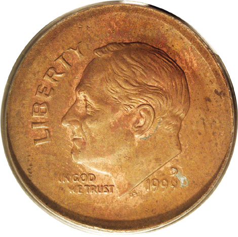 1999 1C Lincoln Cent Obverse Die Muled With a Roosevelt Dime Reverse on a Lincoln Cent Planchet MS66 Red PCGS. This incredible error somehow escaped the scrutiny of Mint employees. We are uncertain how a Lincoln cent obverse die was paired with a Roosevelt dime reverse, but this coin proves that it happened. No others are known to exist: it is believed that the present muling of a cent obverse with a dime reverse is unique. Cross-denomination errors are all but unheard-of from the U.S. mints. The only other examples that come to mind are the Sacagawea dollar/Washington quarter mules, of which about a dozen are known. Incredibly, this type of error occurred only recently, during the entire history of U.S. coinage that spans more than 200 years.
