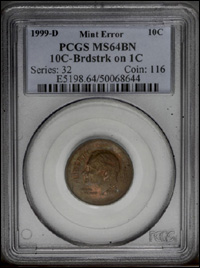 1999-D 10C Roosevelt Dime--Broadstruck on a Cent Planchet--MS64 Brown PCGS. A dramatic error that accentuates the fact that the planchet was incorrect by the broadstruck features. The devices are generally sharp although some of the peripheral lettering displays the distortions caused by the expansion of the planchet during the strike. Traces of zinc alloy are seen in a few places on the obverse and reverse.