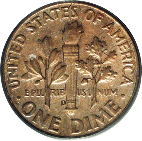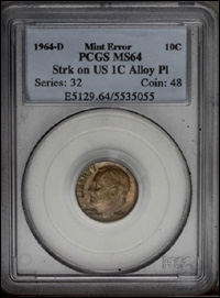1964-D 10C Roosevelt Dime--Struck on a United States One Cent Alloy Planchet. MS64 PCGS. An important error struck during the final year that the silver dime planchets were used for circulation. Demand for coinage was tremendous in 1964, and the mints struggled to keep up with the endless stream of orders as the roll boom was in full swing. This coin was probably created when a strip of copper (for cent planchets) was mistakenly run through the planchet cutting machine when it was set for dime planchets. Thus copper dime sized planchets were made and this particular one made it through the coining process and escaped into numismatic hands. It would seem logical that this type of error would be far scarcer than a dime struck on a cent planchet. A thin die crack extends from the rim through IN toward Roosevelt’s chin.