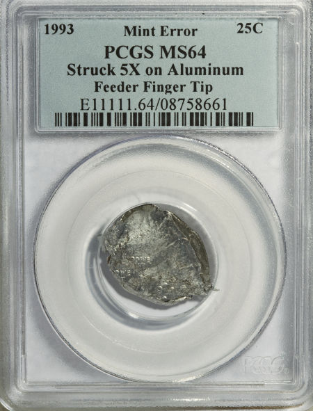 1993 Washington Quarter--Struck Five Times on Aluminum Feeder Finger Tip--MS64 PCGS