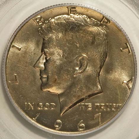 1967 50C Kennedy Half--Obverse Clad Layer Miss.-9.4g--AU58 PCGS