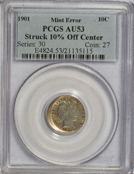 1901 10C Barber Dime--Struck 10% Off Center--AU53 PCGS