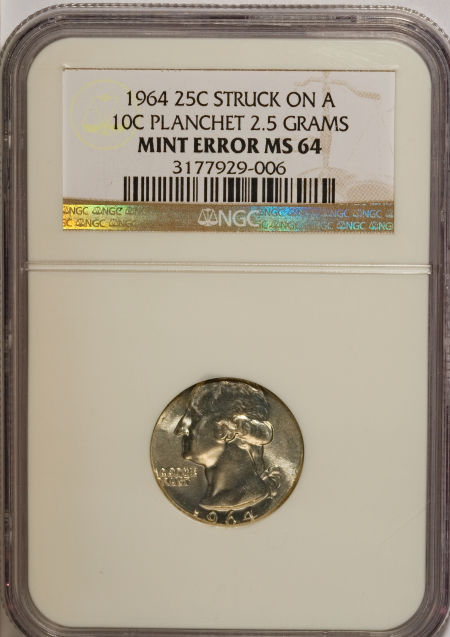 1964 25C Washington Quarter--25C Struck On a 10C Planchet 2.5 Grams--MS64 NGC