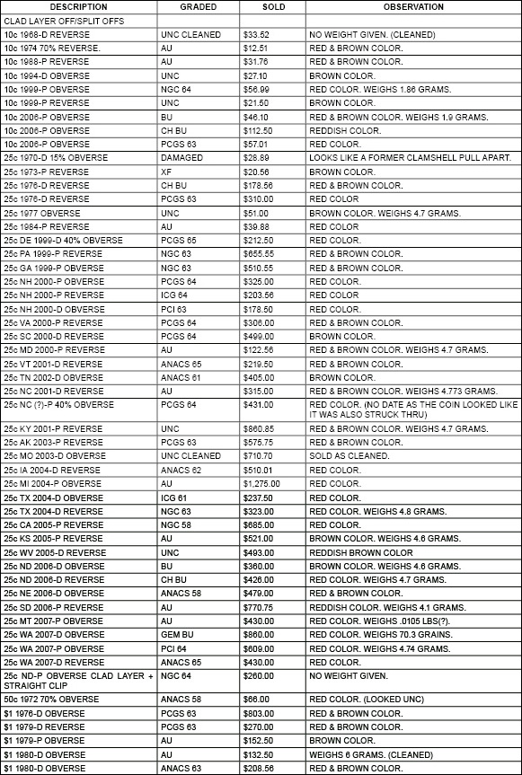 Below are records of recent sales of clad layer split-off mint errors on eBay.