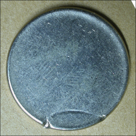 Reverse of an invisible strike nickel that was struck 30% off-center but which shows only the outer portion of the strike. Coin acquired from Paul Burrell.