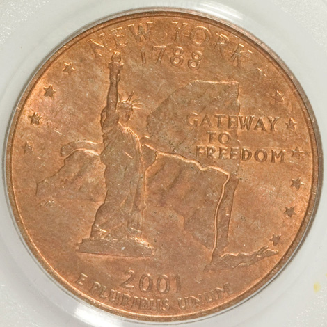 2001-D 25C Statehood Quarter, New York--Rev Clad Layer Missing-- MS62 PCGS