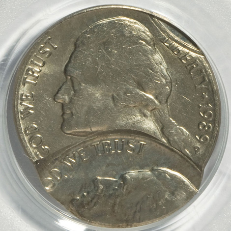1989-P 5C Nickel--Three Strikes, 70% and 90% Off-Center--MS64 PCGS