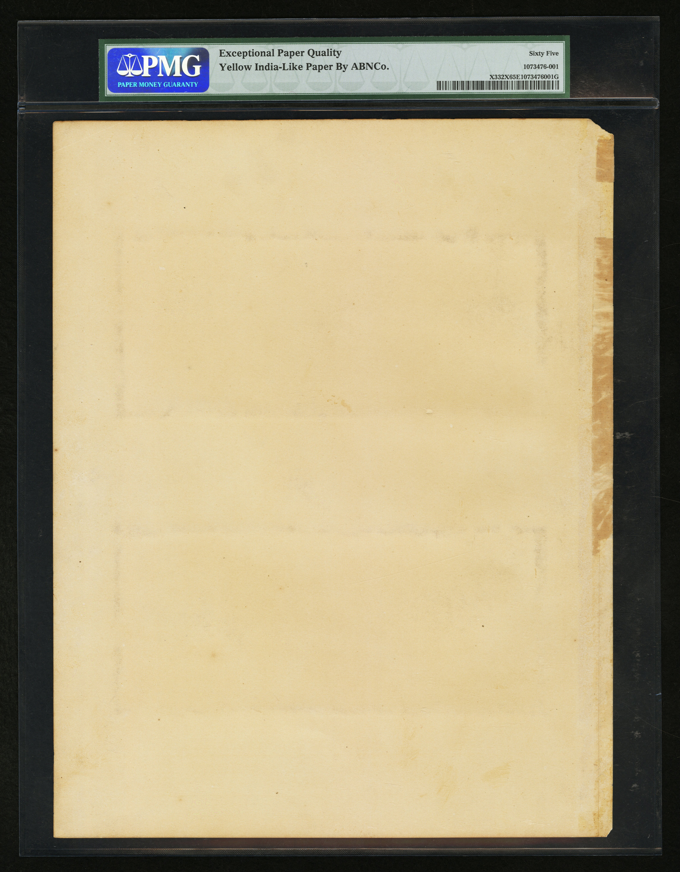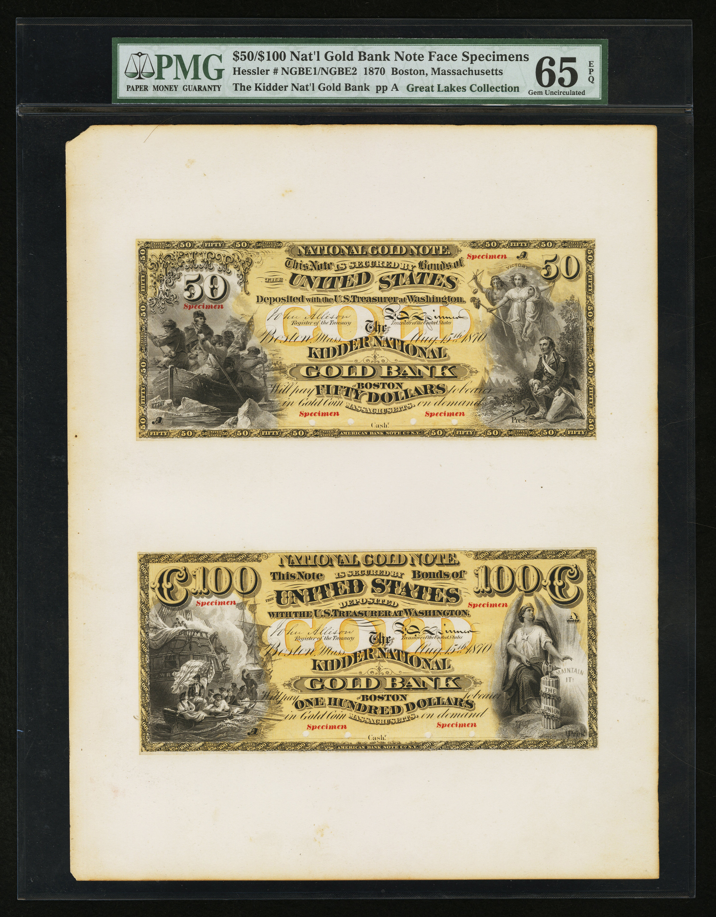 The Kidder National Gold Bank was the first National Gold Bank chartered and was the only one located outside of California. The organizers had second thoughts about the economics associated with operating such a bank in the Northeast, where a National Gold Bank was not needed to secure the circulation of Federal paper money. The bank had a short life. It was organized in August 1870, received its circulation the following March and April, and returned its entire circulation in December 1871. It then liquidated on November 8, 1872. Not a single Kidder National Gold Bank Note entered circulation, although at least one sheet was cut. A more detailed study of the bank's issues includes the following: The bank deposited $50,000 in bonds on August 15, 1870 to secure its circulation. This was followed by another $100,000 bond deposit on November 5, 1870. The first shipment of notes for the bank was sent on March 11, 1871. It consisted of 50 sheets of the $50-$100 combination. A further 75 sheets of the $50-$100 combination were mailed on April 8. All of these notes were returned to the Comptroller of the Currency on December 4, 1871. The bonds backing this paper money were all sold within two weeks. Within the year the bank would exit completely from the scene except for a few specimens of its paper money. A $50 and $100 specimen pair resided in the John J. Ford Collection until it was sold in 2004. The only other specimen pair known is presented here. They are uniface specimens with four small punch cancels each along the signature lines. They are mounted to the same card and then enclosed in a PMG multi-note holder. Each "note" is marked "SPECIMEN" four times in red ink. The paper for the specimens has a gold tint. This is a great item that is one of the highlights of this auction and destined for the finest of collections.