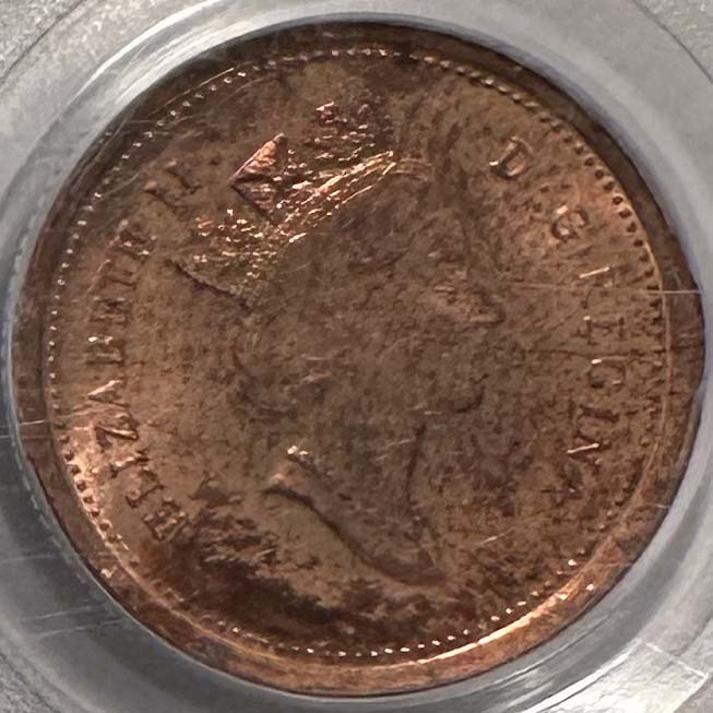 The Royal Canadian Mint accidentally struck two of these experimental planchets when the 1998 Dimes were being produced. The two planchets were not fully plated and show the bright red copper layer. With only two known, this is an extremely rare mint error since the experimental planchet was not fully plated and were accidentally struck with 1998 Dime dies.