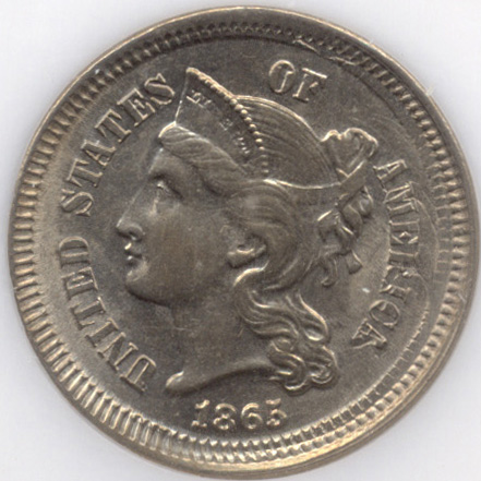 1865 3¢ Nickel Double Struck Flip-Over in Collar