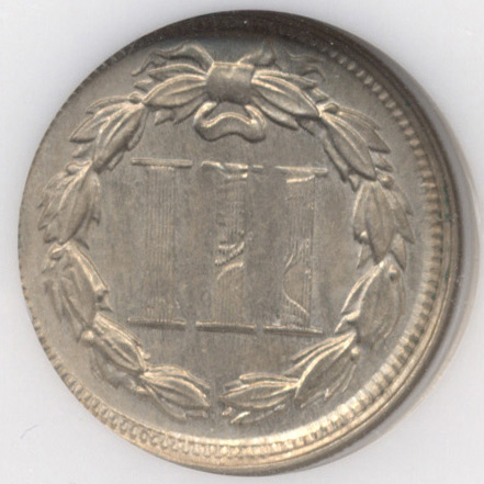 Major errors in the 3¢ Nickel series are extremely rare. This is the only double struck known for any date in mint state.