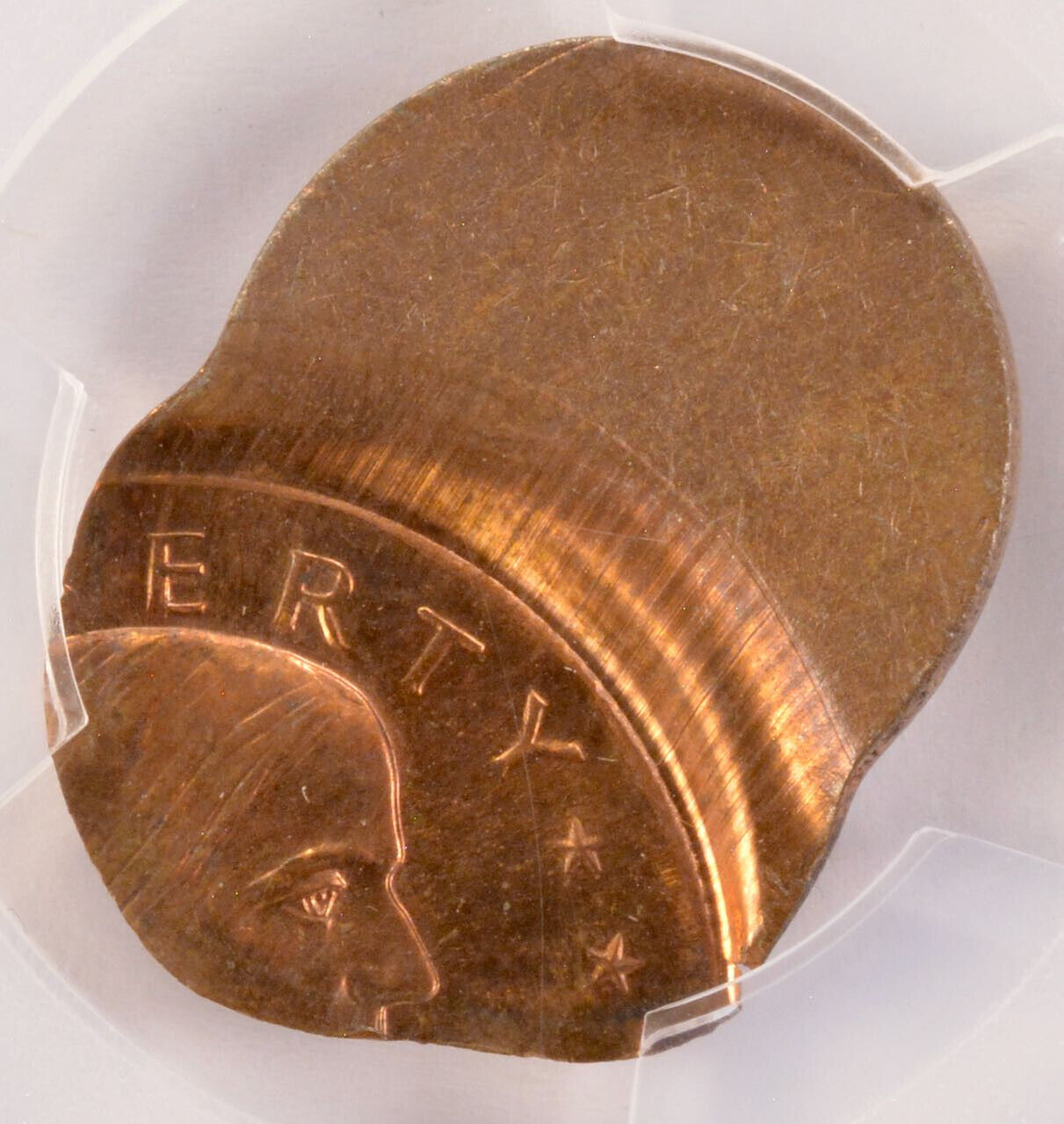 A copper cent planchet was accidentally mixed with clad planchets for the SBA Dollar. It entered the collar and was struck off-center on top of an SBA planchet. Therefore, only the obverse die struck the copper cent planchet and the reverse die struck the SBA clad planchet. A spectacular, rare and dramatic multiple major mint error in the SBA Dollar series.
