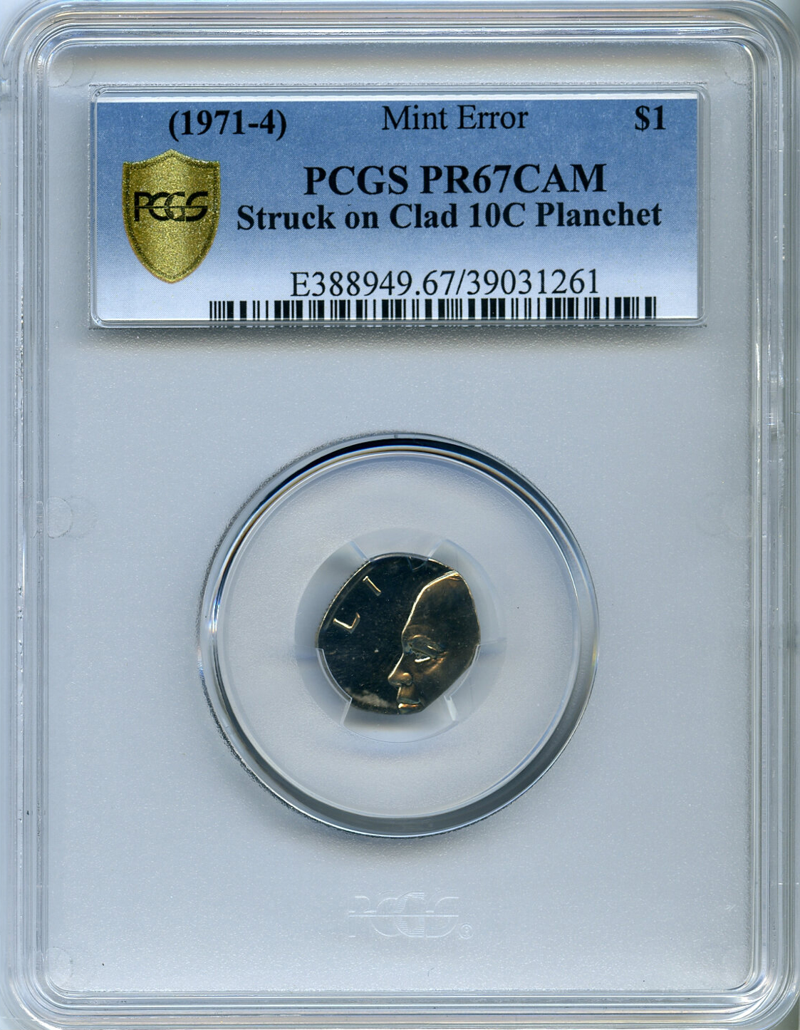 There are a few proof Ike Dollars struck on clad dime planchets known. These are very rare and highly prized by Ike Dollar collectors and mint error collectors. This off metal shows Eisenhower's head positioned nicely on the obverse and the eagle on the reverse. This Ike Dollar on a Dime mates to another Ike Dollar off metal since it has a straight edge from being struck next to another planchet.
