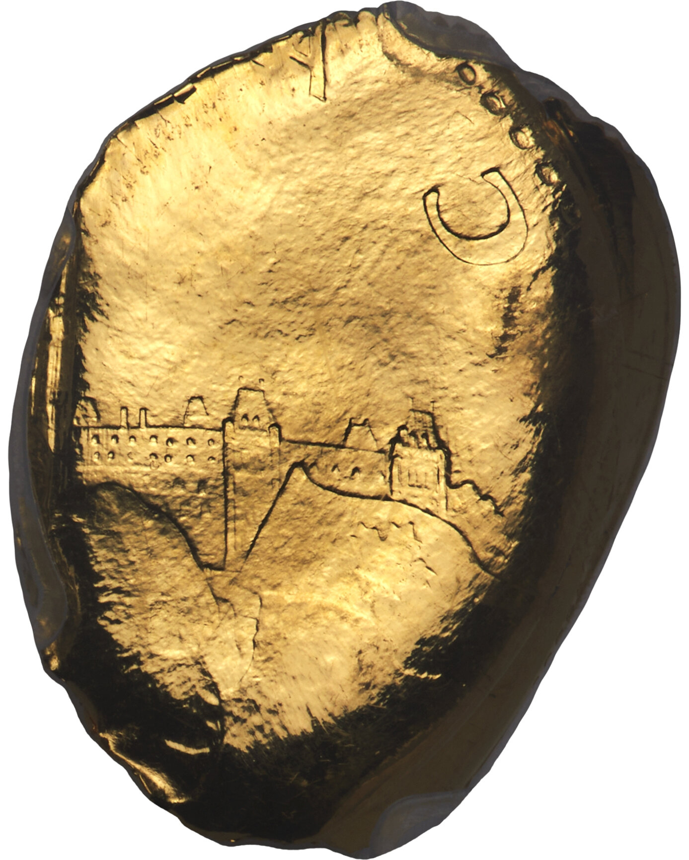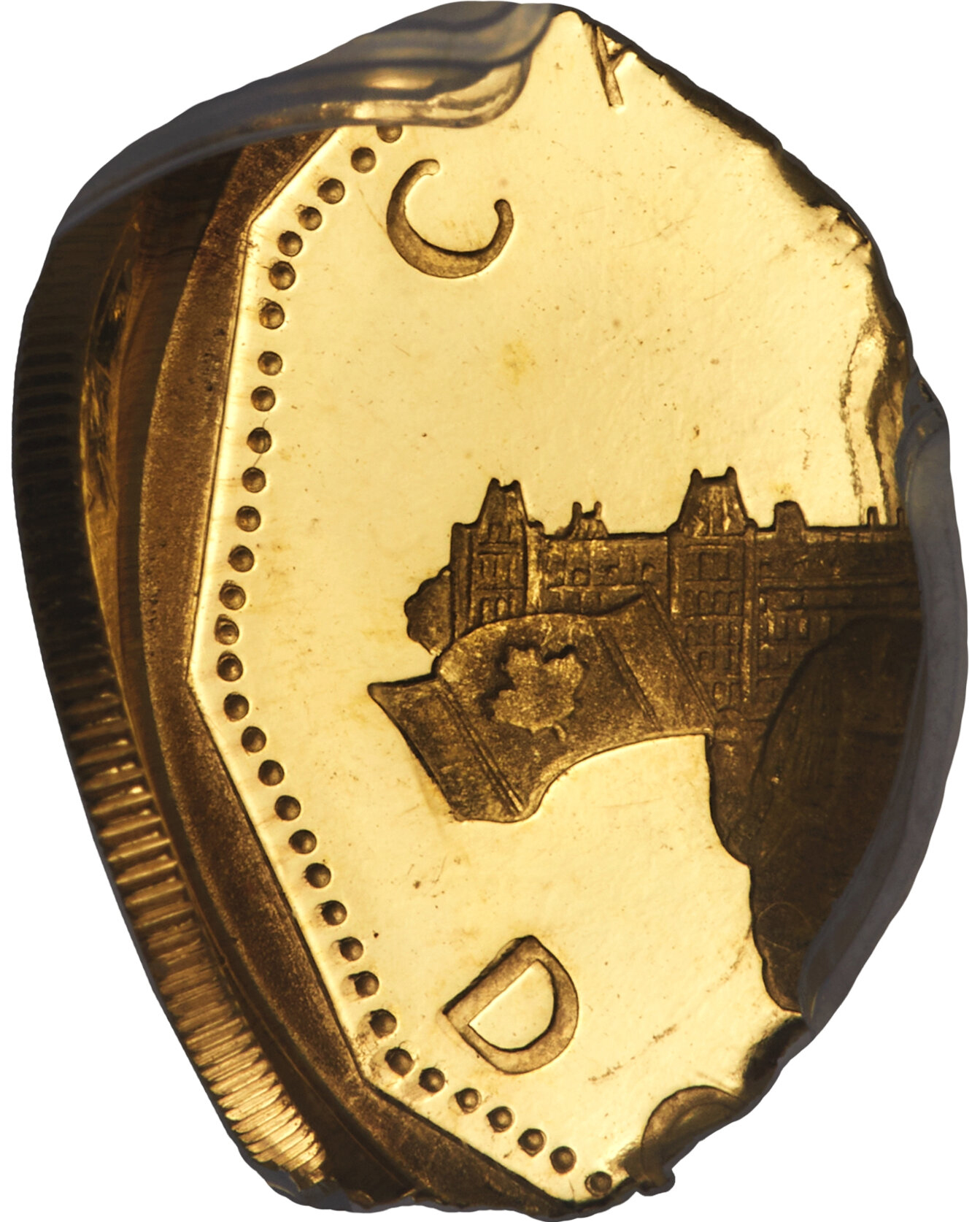 This is a 1992 $5 Gold Maple Leaf Planchet that was struck 25% off-center with a 1992 Parliament $1 Commemorative reverse. The tremendous force of the strike caused the planchet to bend to nearly a 90-degree angle!