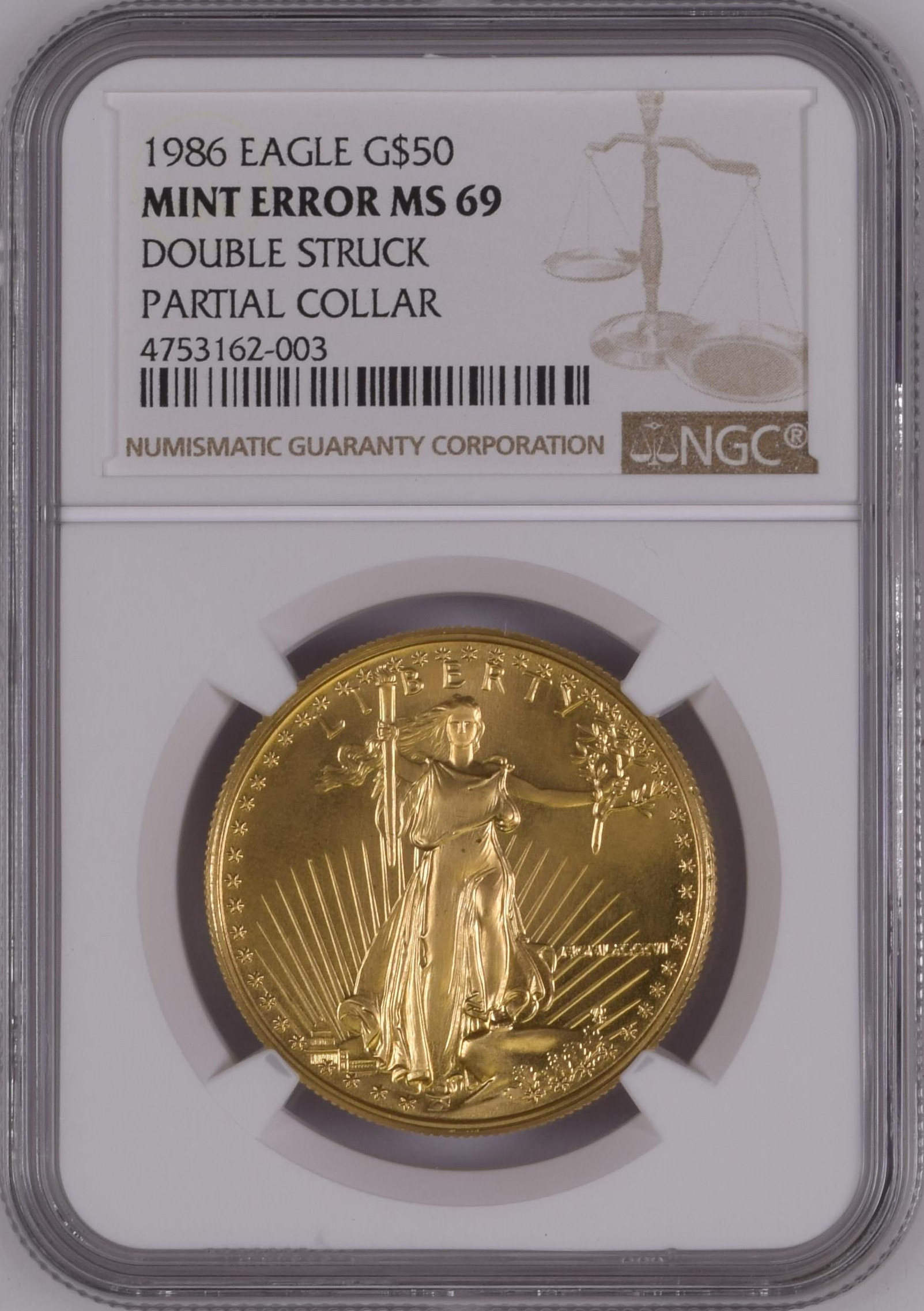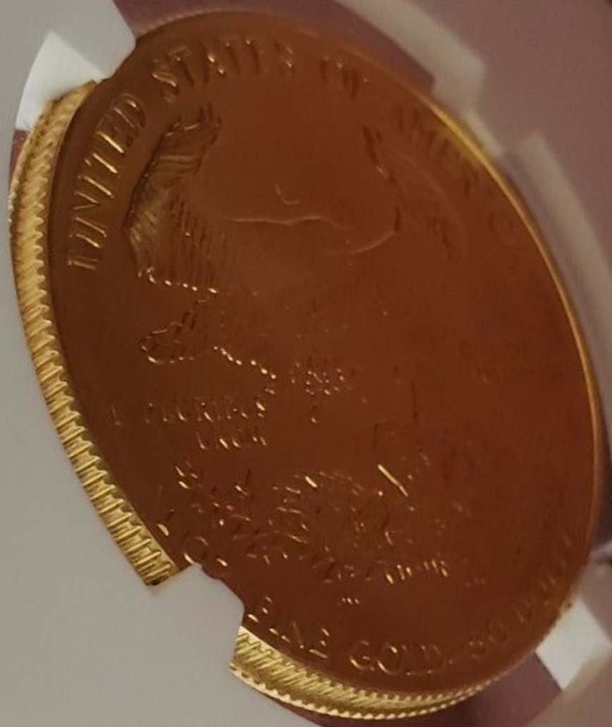 Major Mint Errors on the 1oz Gold U.S. $50 American Eagle series are very rare. There are only a few known that were struck with partial collars or broadstruck out of the collar. This $50 Gold Eagle was double struck and has a partial collar with reeding on both edges. All double struck U.S. gold coins are extremely rare and highly desirable by collectors.