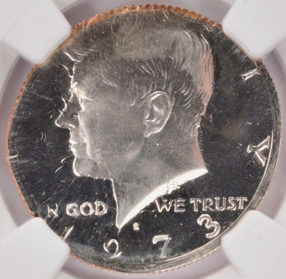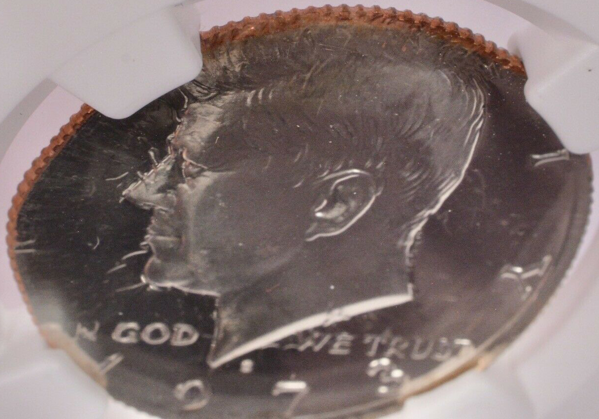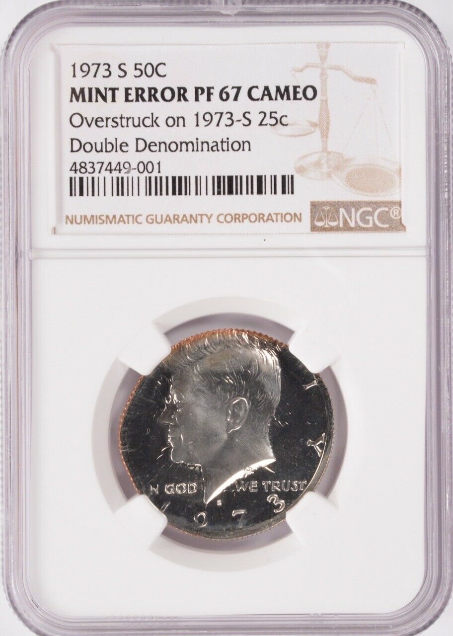 It was just authenticated and certified by NGC as Proof 67 Cameo and is an amazing proof mint error. Some of the original detail from the quarter design is evident on both the obverse and reverse. It has full reeding from the quarter strike and shows the copper core along the edge. The 1973-S date from the quarter is visible below the 1973-S date from the Kennedy Half.This newly discovered and certified Proof Kennedy Half Dollar on a struck Washington Quarter is one of only two known Kennedy Half Double Denomination on any proof U.S. coin.