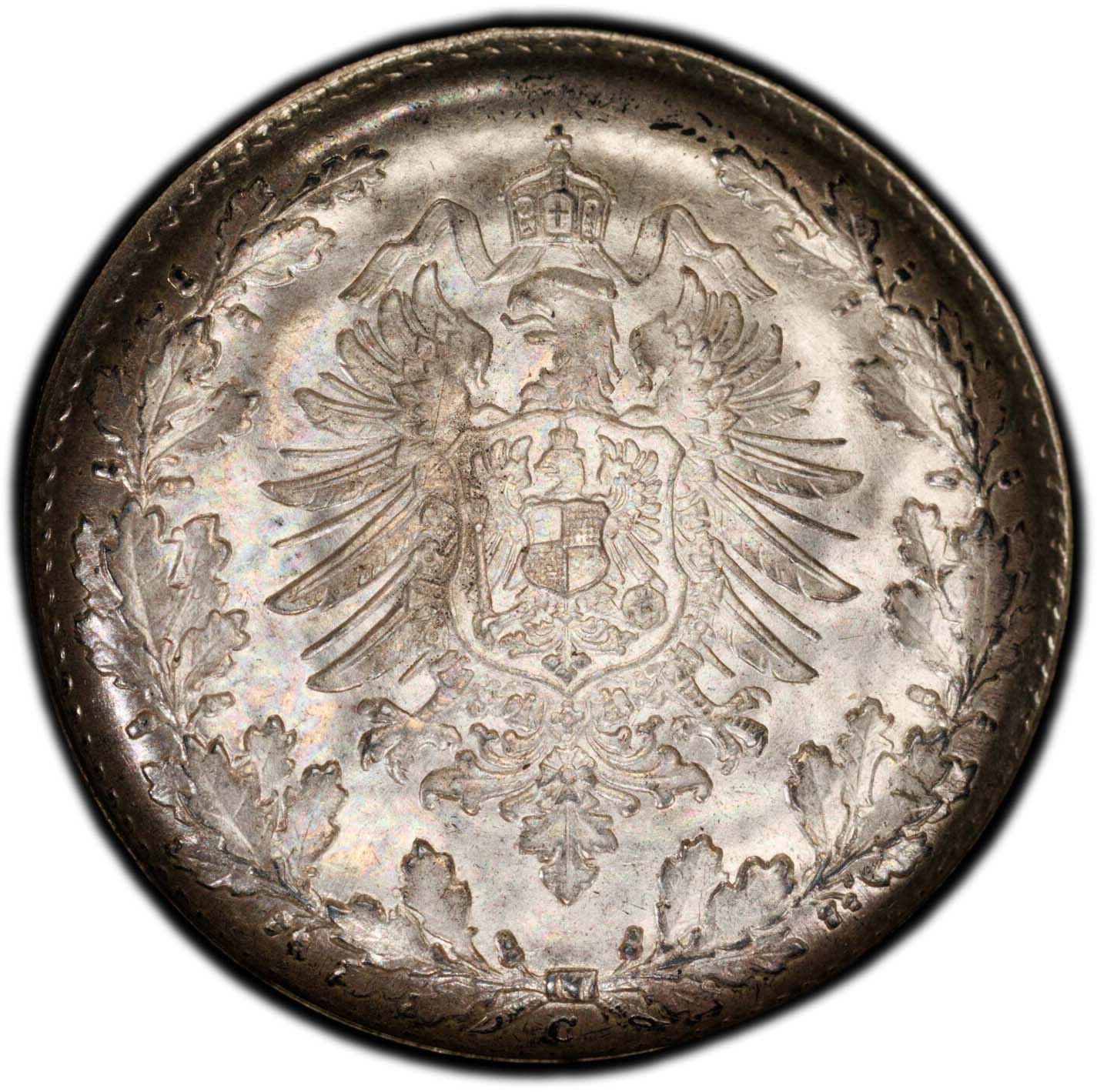 This is a fantastic and unique German Empire deep die cap on a silver 50 Pfennig. This die cap belongs in a collection of mint errors or German coinage.