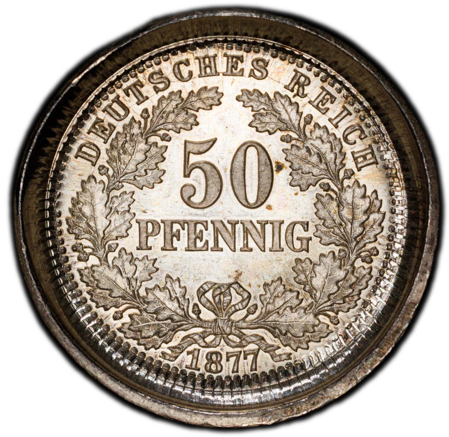 unique Silver German die cap. It is dated 1877, was struck at the Frankfurt Mint and is in gem mint state condition. There are a couple of German die caps from German States known, but they are in copper and on smaller denominations. Additionally, there are a few known German die caps from 1900 to 1923 from the German Empire and the Weimar Republic, but these are in the base metals of copper, zinc and aluminum.