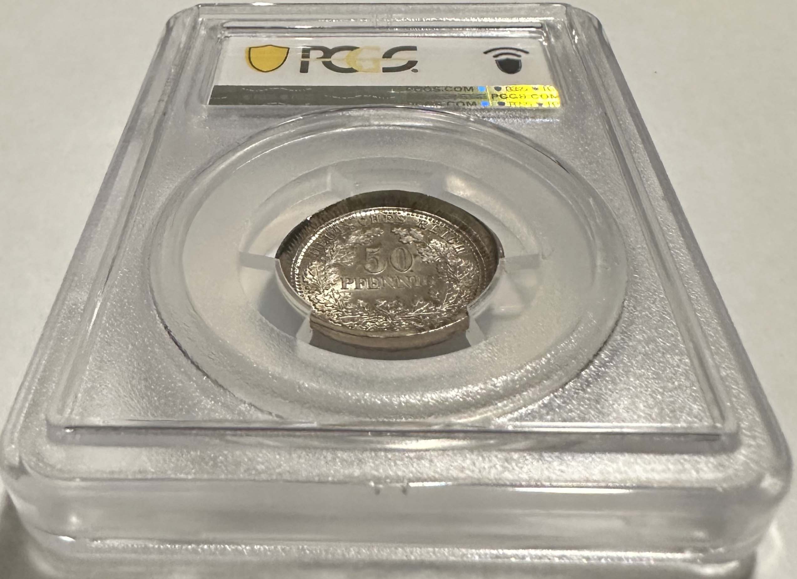 This unique Silver 50 Pfennig is a deep obverse die cap with the wreath/date design. If this were a reverse die cap, that cupped the anvil die (lower die) it would have flattened out as it expanded. A normally struck silver 50 Pfennig is 90% silver, weighs 2.77g, and has a diameter of 21mm. This much larger 50 Pfennig expanded in size as it cupped the