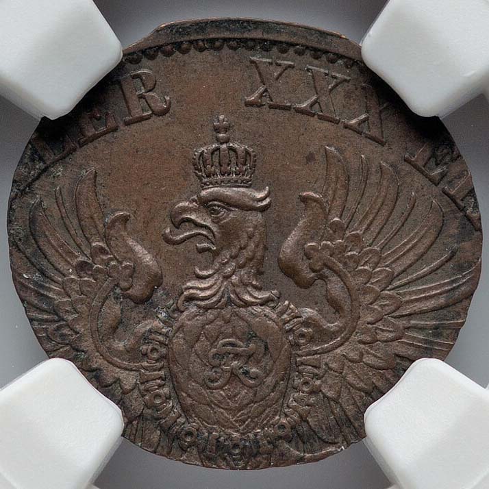 This copper one Pfennig planchet was struck by Taler dies and is virtually as struck and in gem condition. The obverse is uniface since the planchet indented a silver Taler planchet. The reverse shows the Taler reverse design of the crowned heraldic eagle.