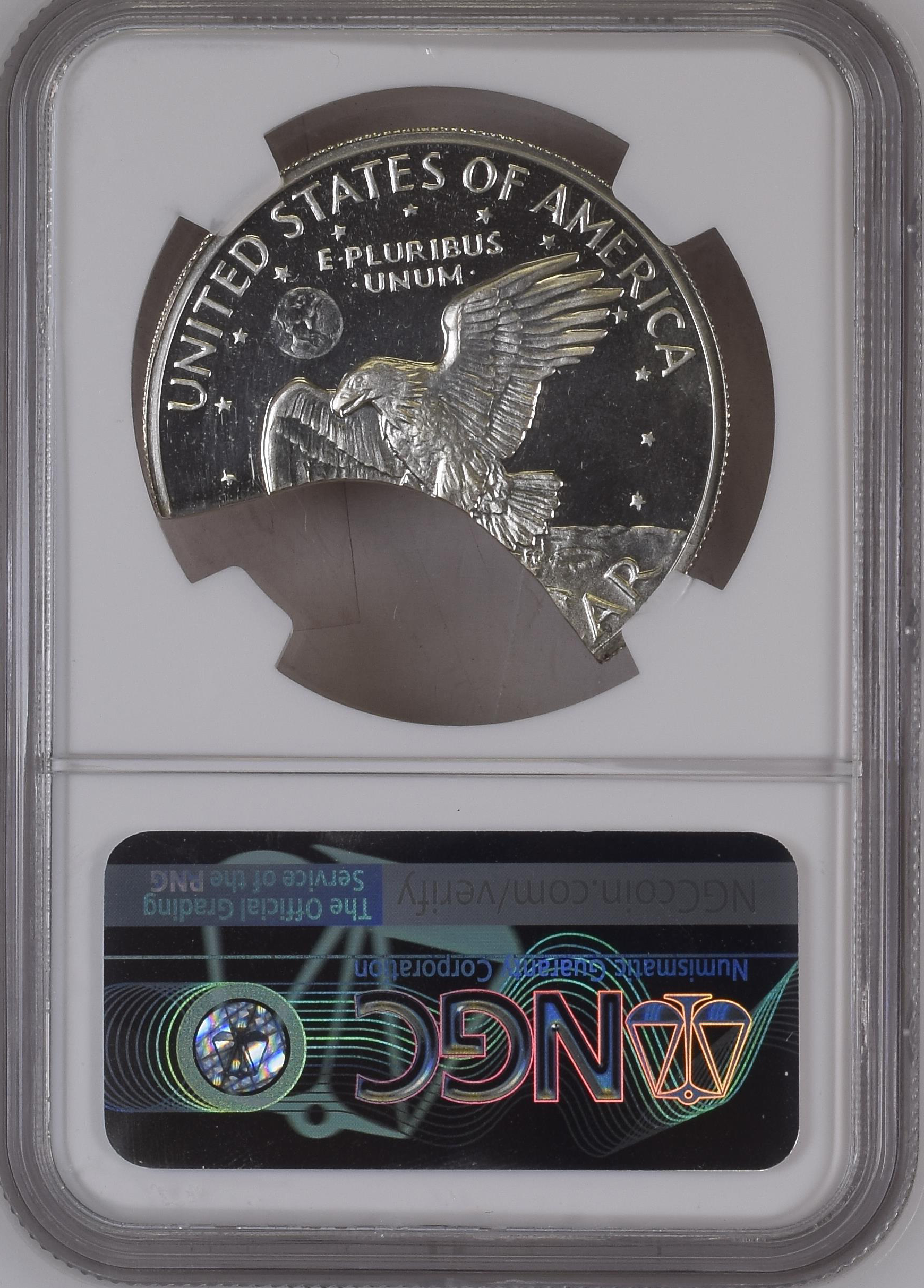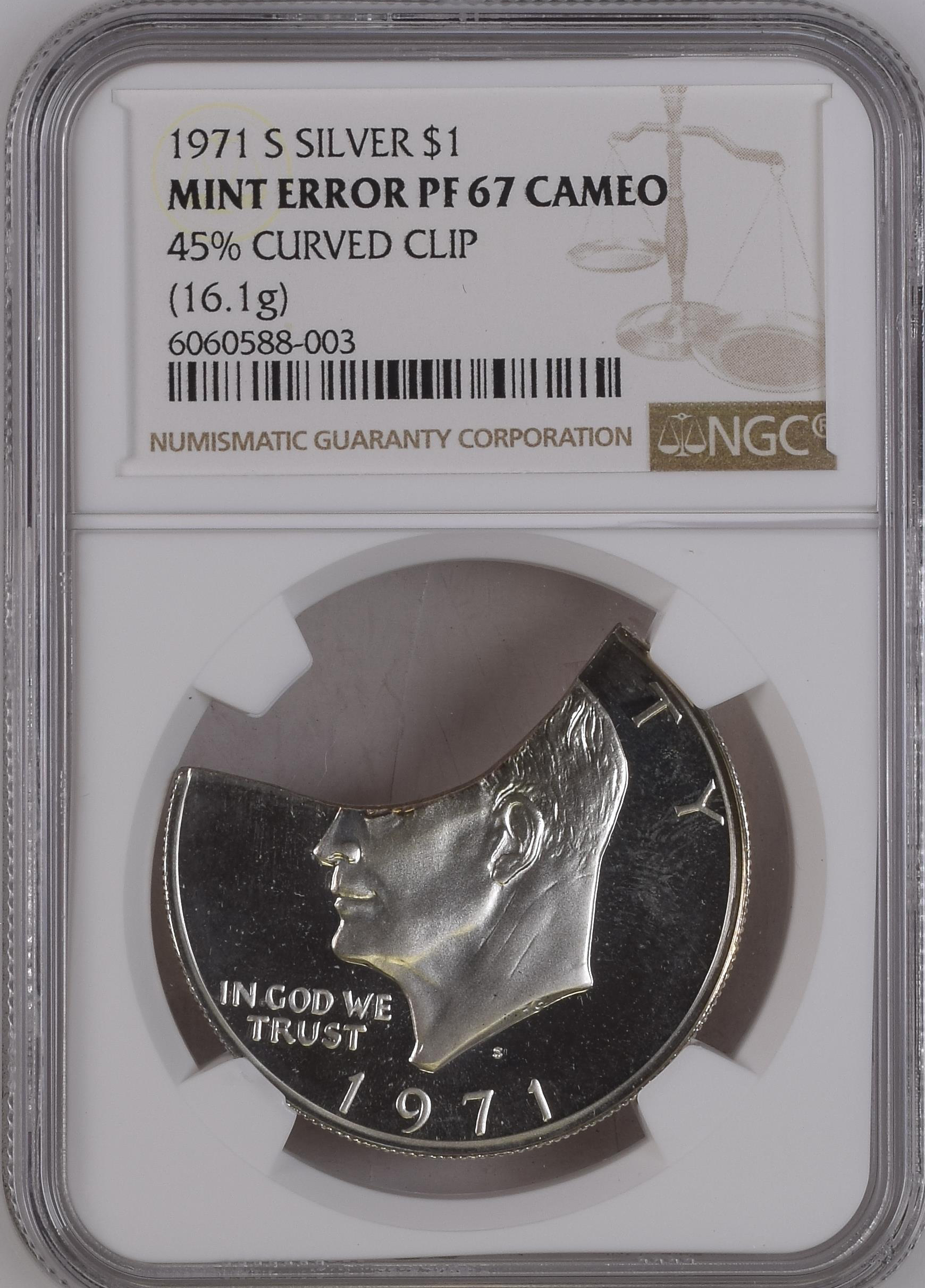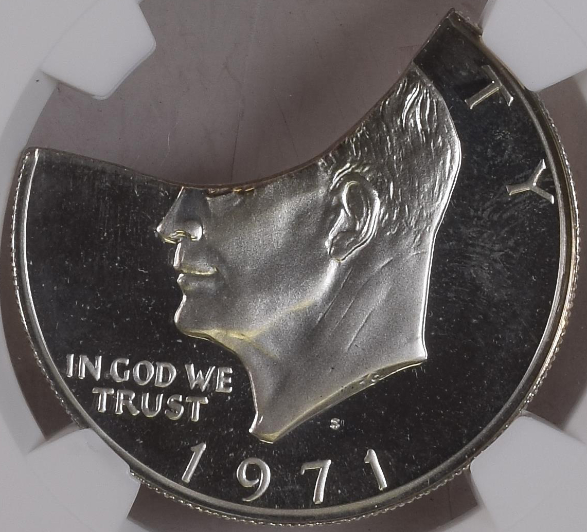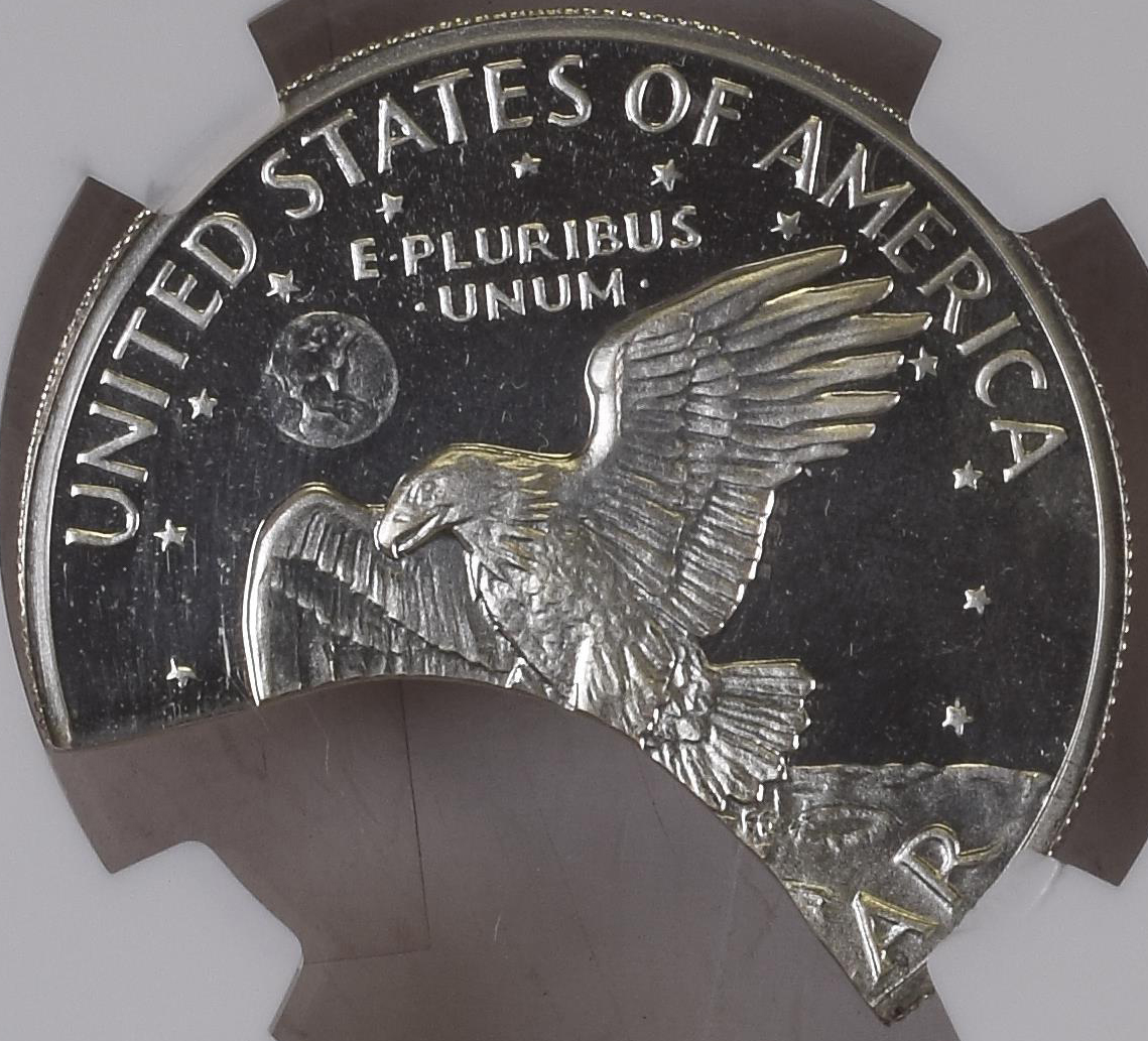 This unique discovery of a Silver Proof Ike Dollar on a clipped planchet brought excitement to serious collectors of Ike Dollars and major mint errors. It was struck on a 45% curved planchet (by weight). It is amazing that this mint error survived the minting process and was just certified by NGC.