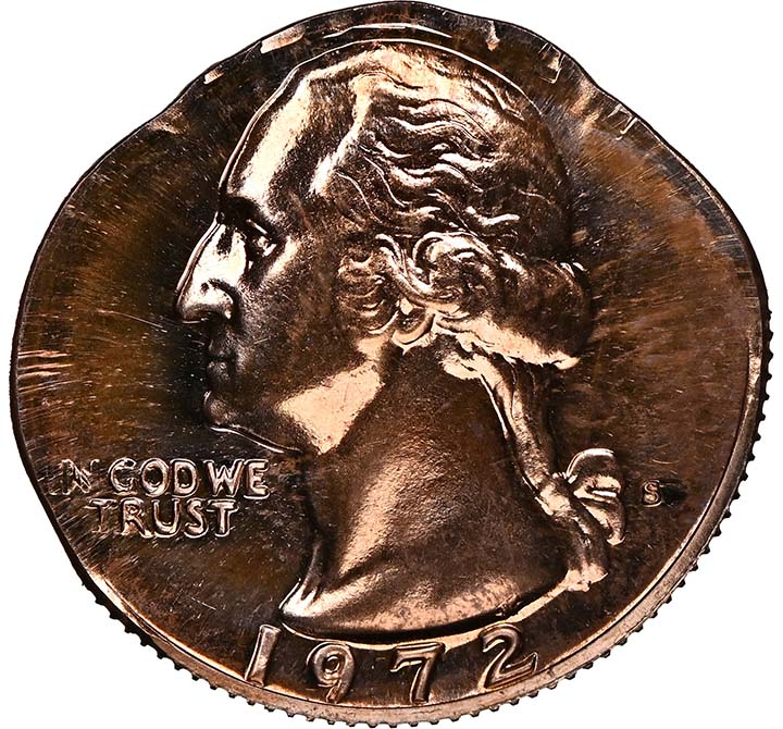 Although there are a few known proof Washington Quarters struck on copper Cent planchets, this one is unique since it was double struck. It is in gem proof condition, shows the complete date and is a stunning example of a proof off-metal.