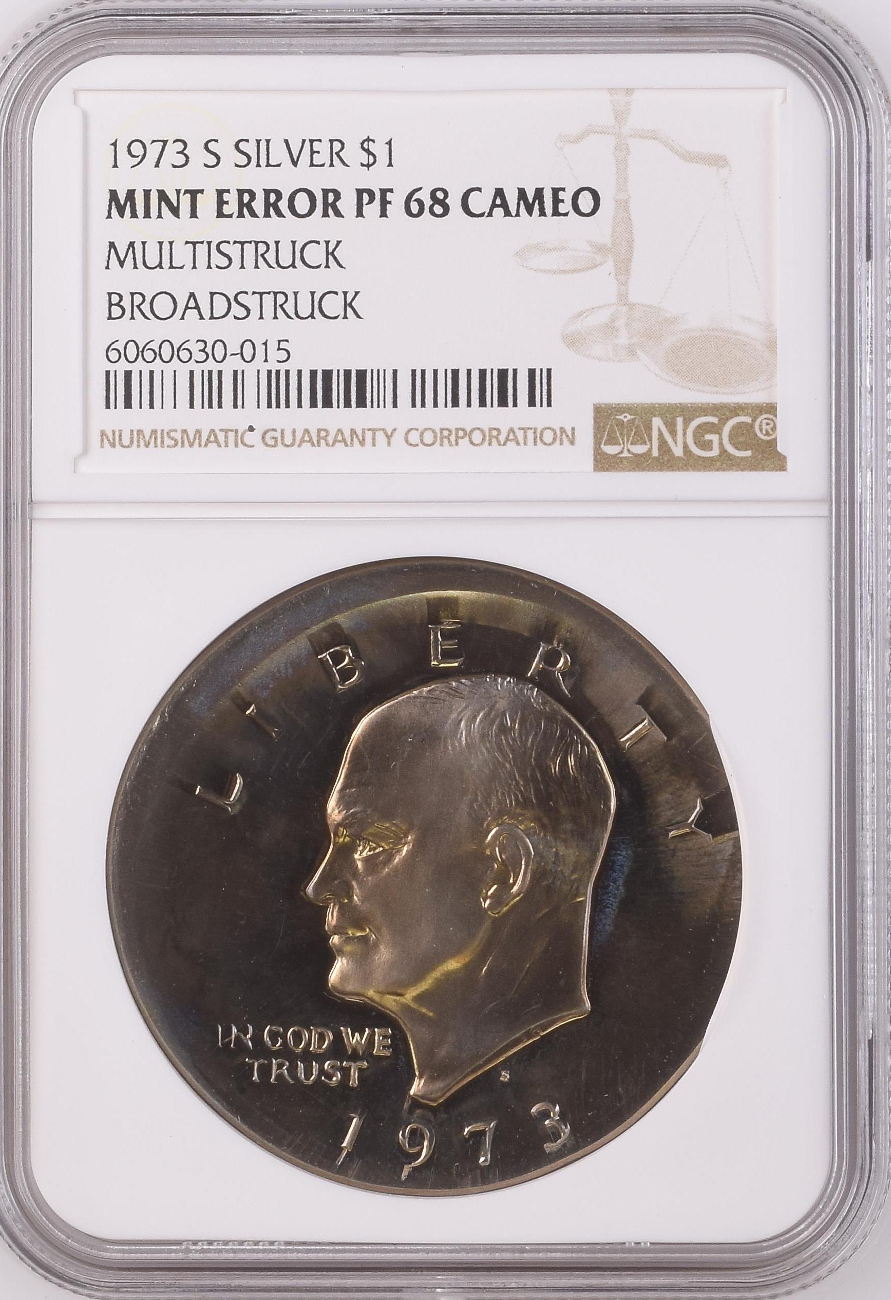 This proof Ike Dollar was multistruck and broadstruck on a SILVER planchet. The first strike was normal with full reeding. The subsequent strikes were broadstruck out of the collar. There is visible design of the first strike, including a double profile and LIBERTY on the obverse, and a double UNITED STATES OF AMERICA and eagle's wing on the reverse.
