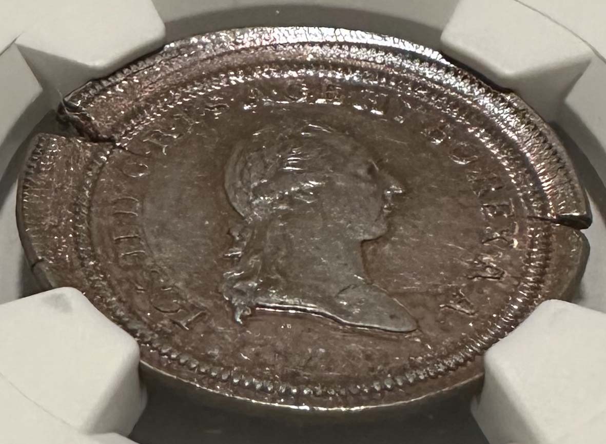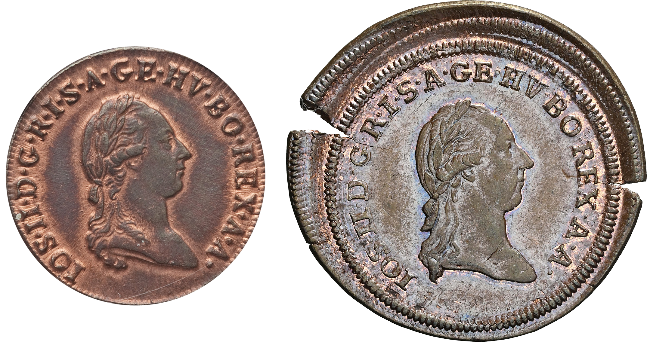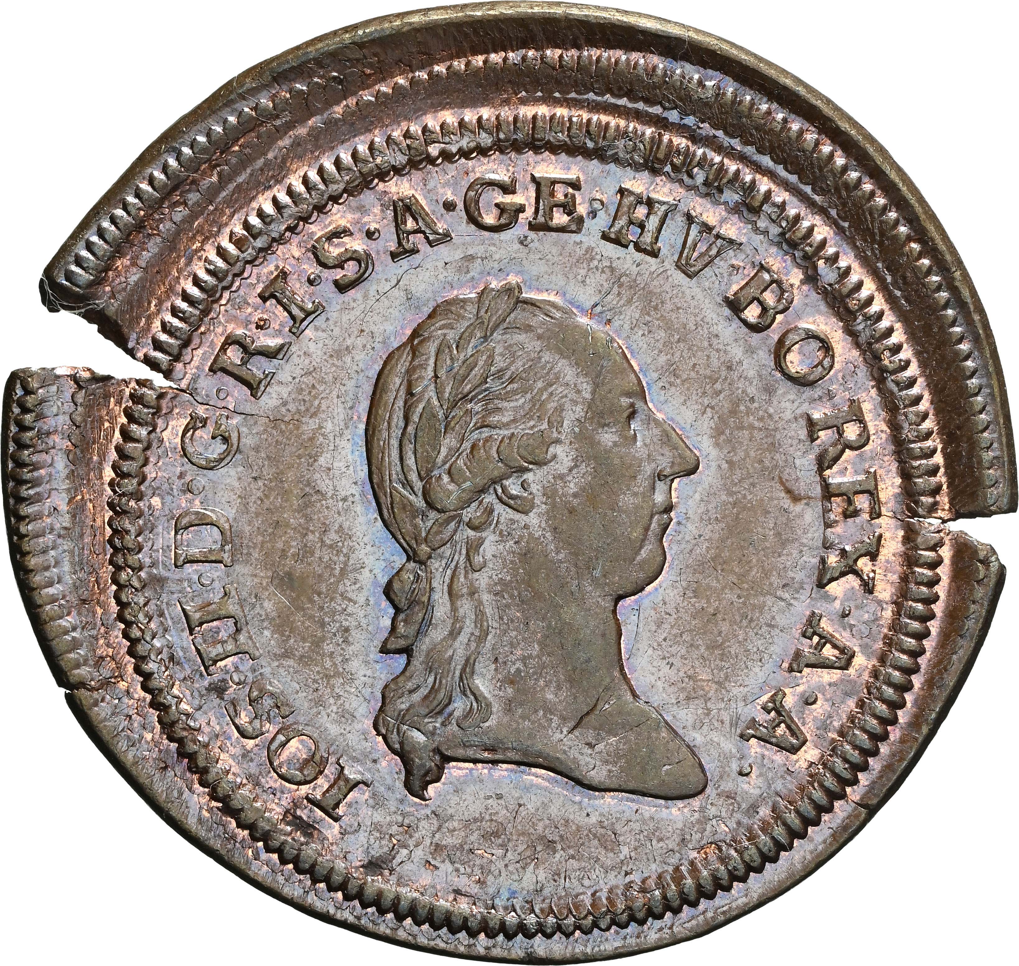 This unique and dramatic obverse die cap was struck in 1782 in Austria at the Vienna Mint. The diameter for a regular 1 Kreuzer is 24 mm, with a weight of 7.4 grams and a thickness of 2 mm.