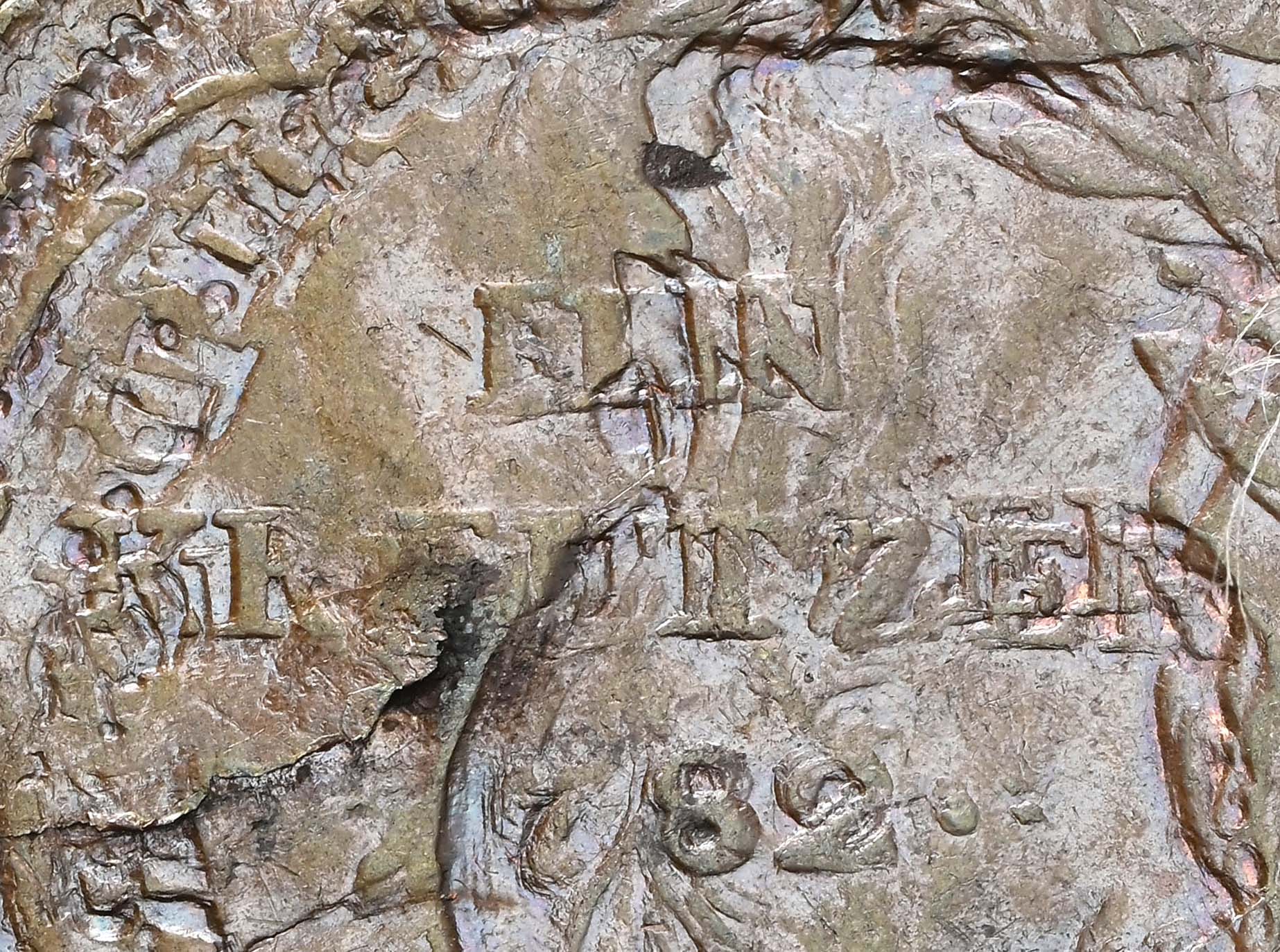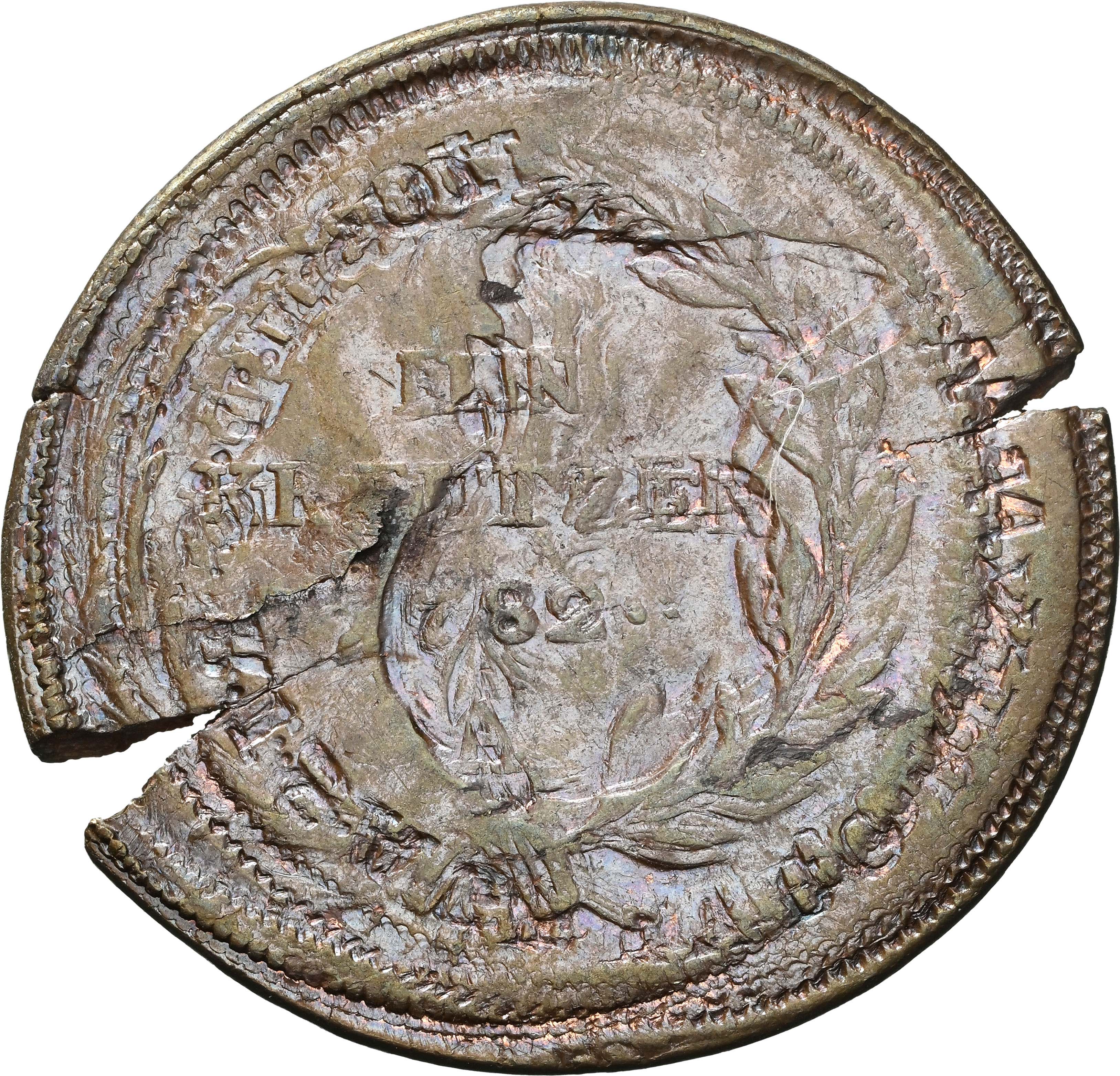 This obverse die cap expanded considerably to over 32 mm as it capped the obverse die. It was struck multiple times as it wrapped around the obverse die. The pressure from the multiple strikes actually split the planchet in two areas.