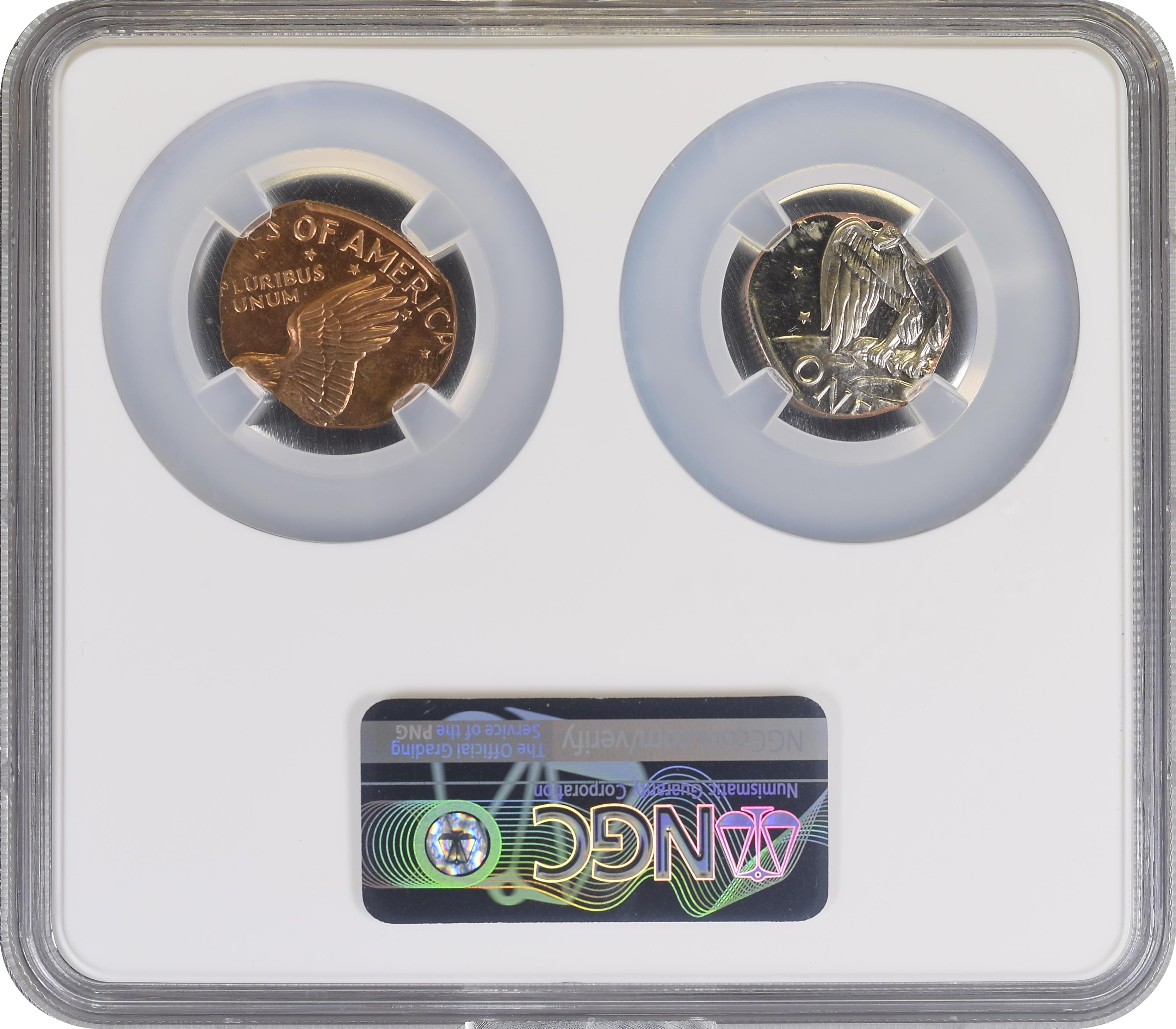 This is an amazing off-metal mated pair of U.S. proof coinage that combines two different off-metals. This mated pair is the third known certified pair and is visually breathtaking. The original discovery was featured on the cover of Mint Error News Magazine and in CoinWeek. A clad dime planchet and a copper cent planchet were intentionally placed in the collar at the same time and were struck by both the obverse and reverse Ike Dollar proof dies. The placement of Eisenhower's head on the obverse and the eagle on the reverse is perfectly positioned.