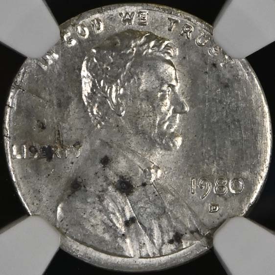 This 1980-D Lincoln Cent was struck on an unidentifiable silver planchet with a weight of 2.1 grams. U.S. silver Dimes were not struck since 1964 on 2.5g planchets.
