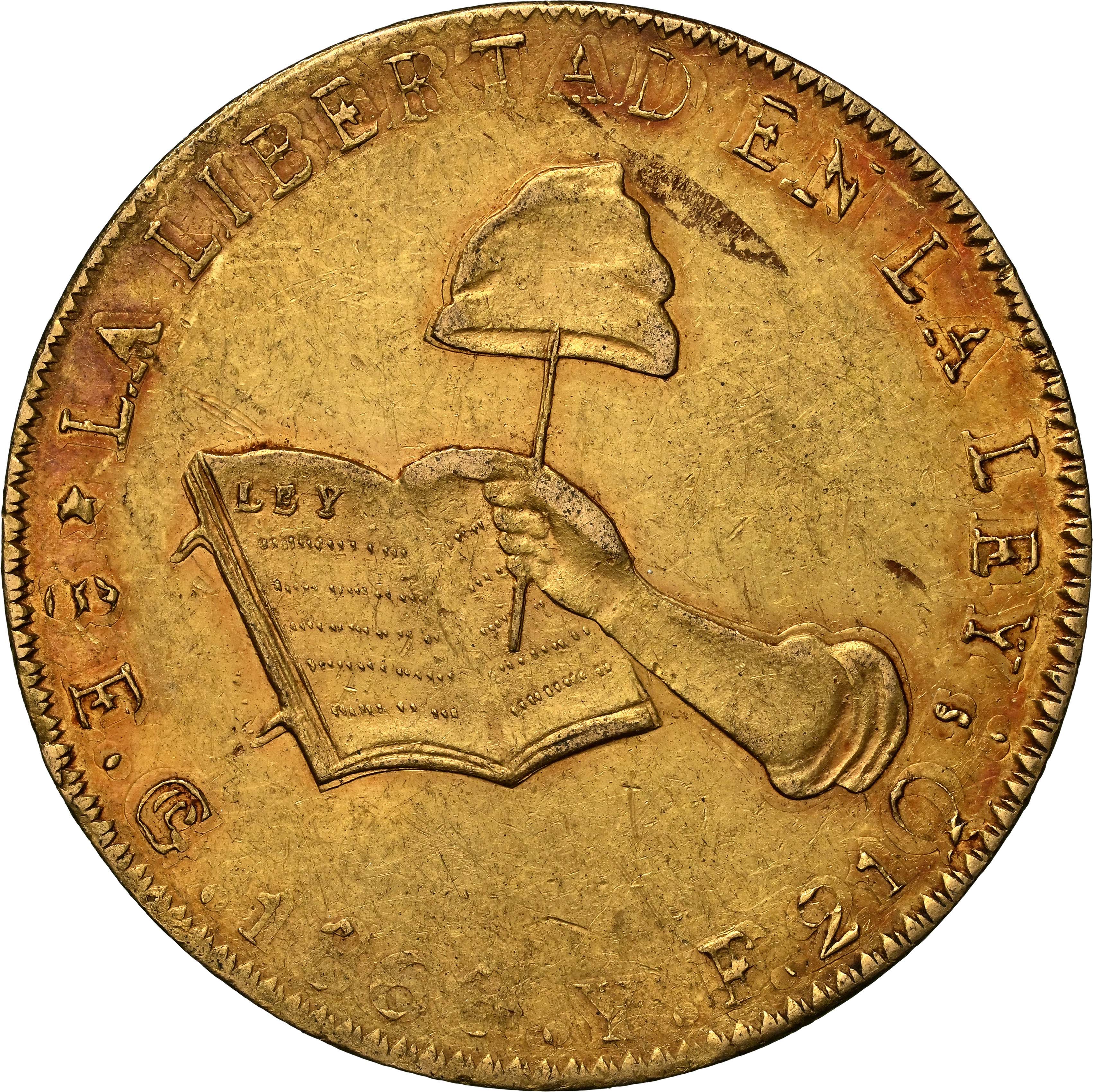 This famous design was struck from 1828 through 1870 and is cataloged in Krause as KM 383.7. The obverse features a hand holding a cap above a book, while the reverse portrays an eagle perched on a cactus holding a snake in its beak.