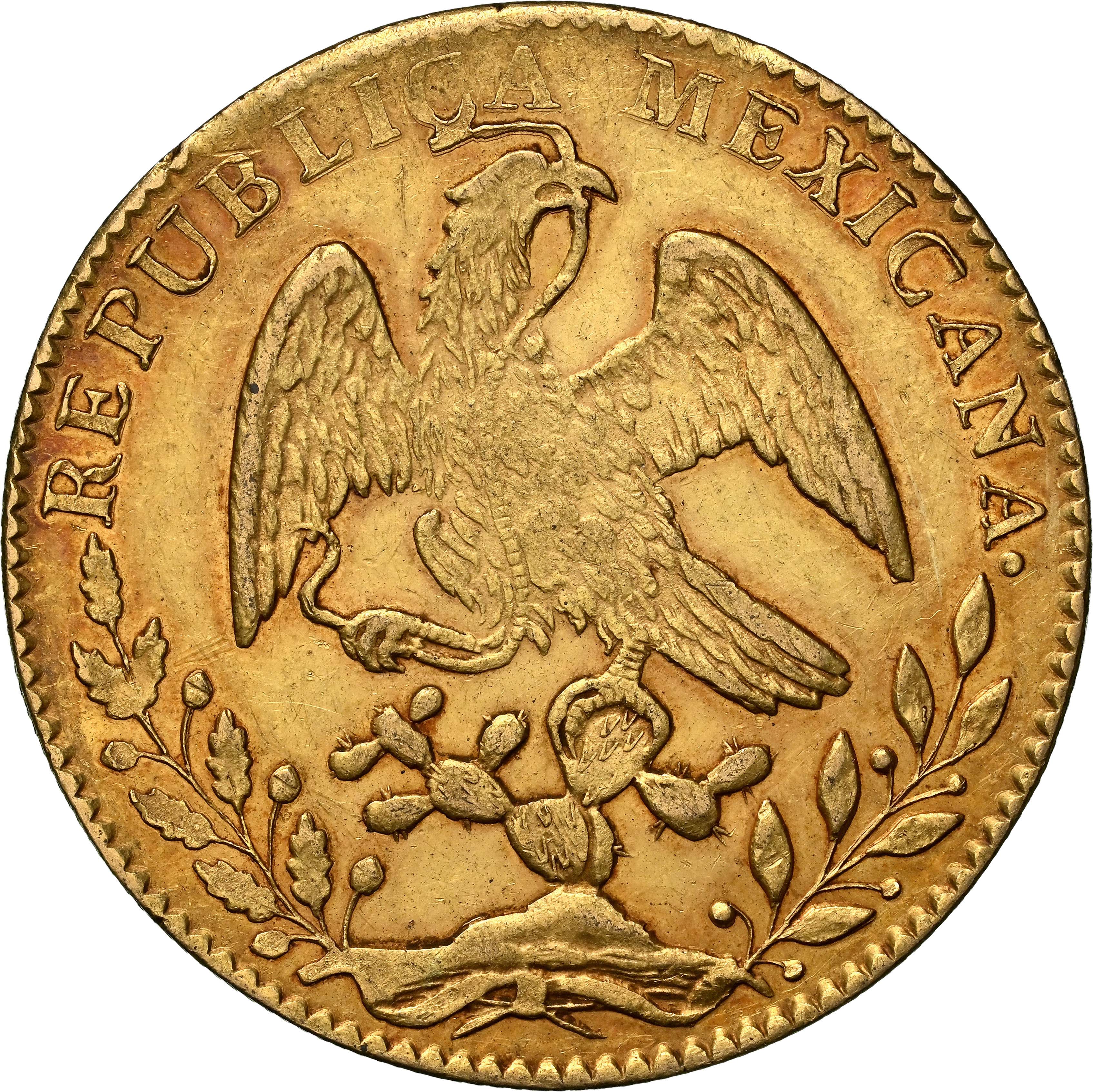 This 8 Escudos was struck at the Guanajuato Mint. The first known coinage from this mint was struck under Spanish colonial rule in 1812. The Mexican War of Independence from Spain ended on September 27, 1828.