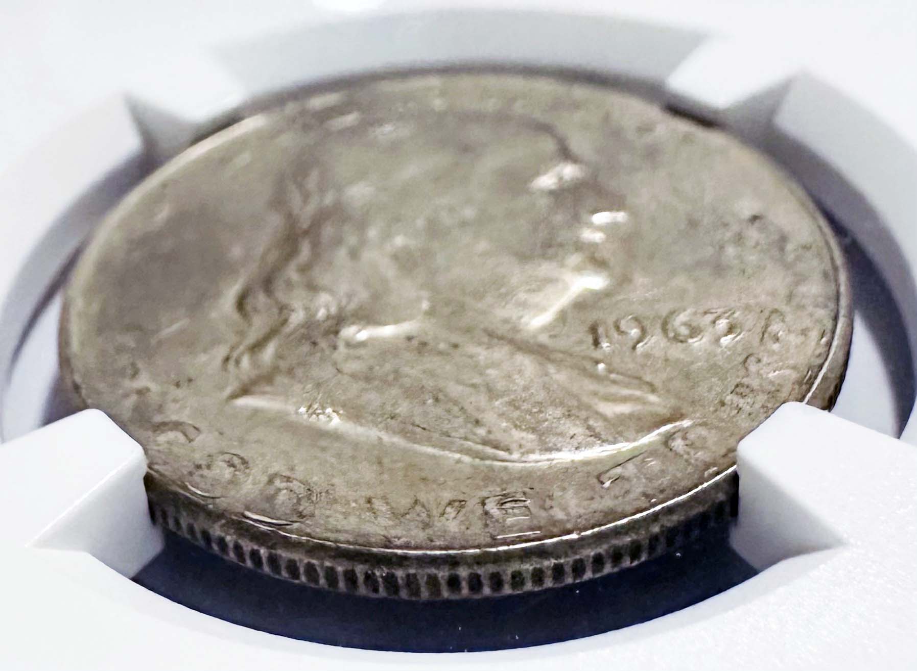 This 1963 Franklin Half Dollar was struck on a wrong planchet with a composition of 75% silver and 25% copper and a weight of 12.60 grams. It was authenticated and certified as a mint error by NGC.
