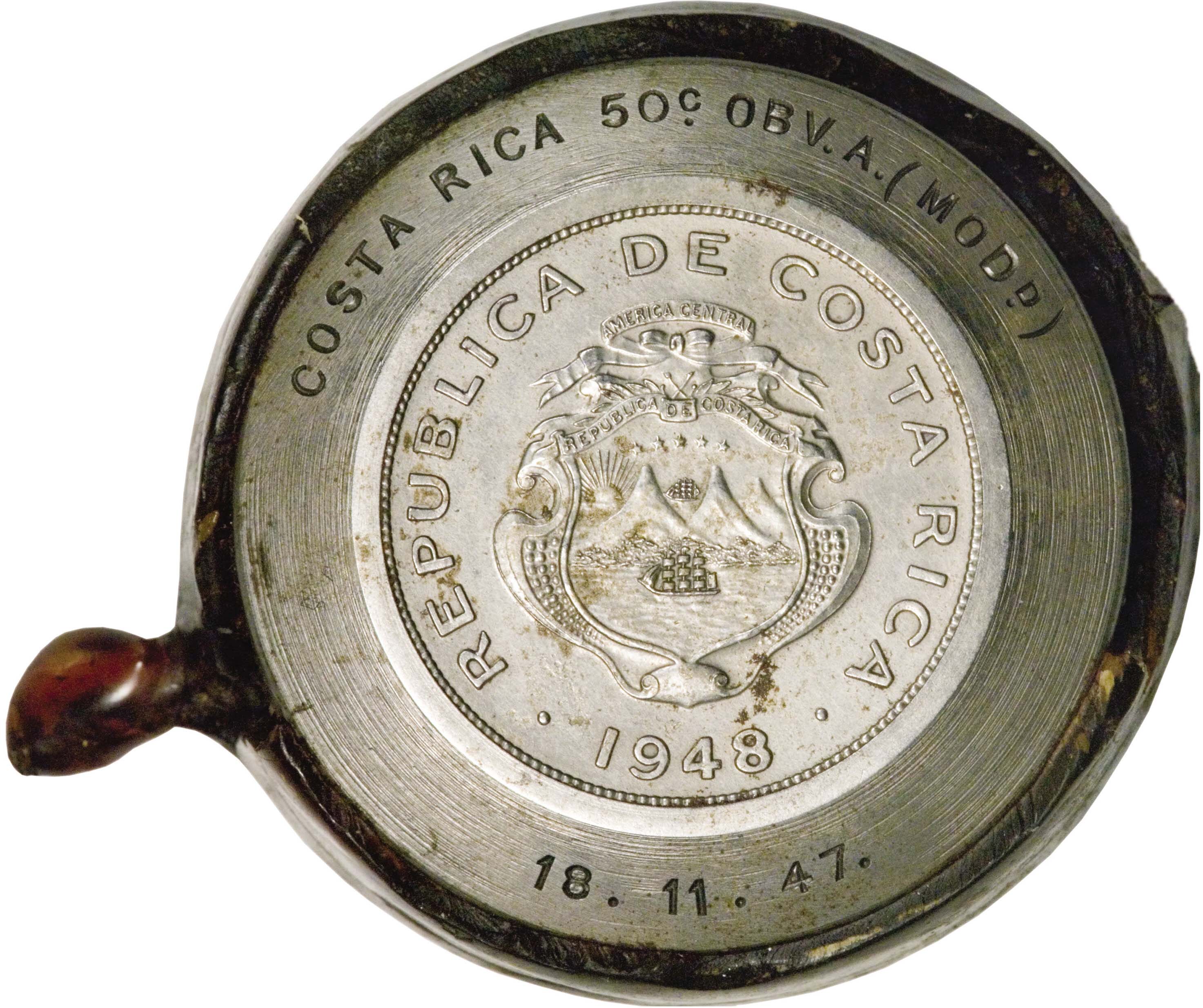 This is a unique pair of uncancelled obverse and reverse hubs for the Costa Rica 1948 50 Centimos coin. The Royal Mint in London, produced the hubs & dies, and also struck the 1948 50 Centimos for Costa Rica.