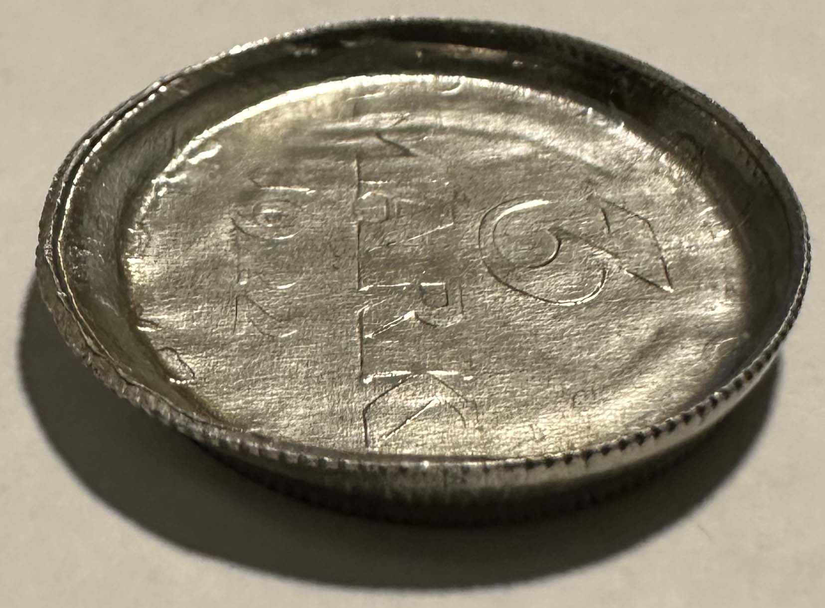 This is an extremely rare pair of German 3 Mark Mint Errors. One is a deep reverse die cap shaped like a bottle cap. The other was struck 40% off-center and is shaped like a baseball cap.