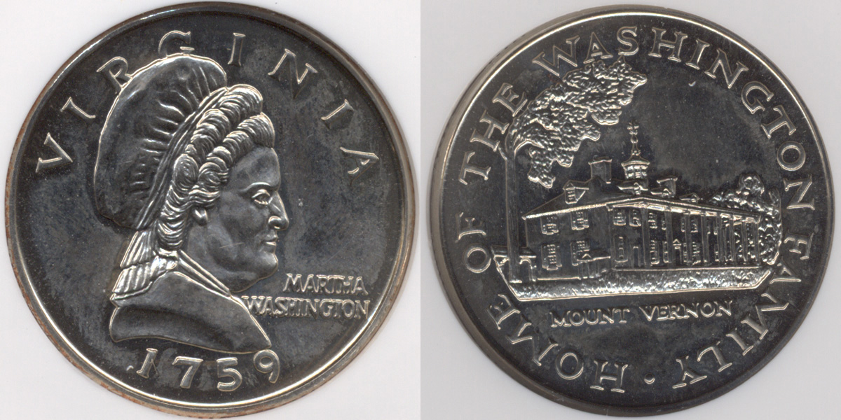 In August of 2000, I discovered a Martha Washington Test Piece on a copper-zinc Cent planchet that was struck 10% off-center with a uniface reverse. This discovery was a front page Coin World article on August 7th, 2000. In a response to the Martha Washington Test Piece that I discovered, the Mint announced that "the dies are available to the Mint's metal and blank vendors for testing." This die trial piece was discovered by a Brinks employee. It is in gem mint state condition with red and brown toning. The obverse design of the die features a bust of Martha Washington facing right. In the right field is the inscription MARTHA WASHINGTON. Above the portrait is VIRGINIA and below the date 1759.