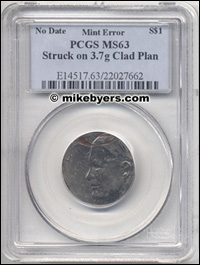 This unique Ike Dollar off-metal was just discovered. There is mystique and excitement surrounding this recently discovered Ike Dollar struck on clad planchet that weighs 3.7 grams. It is the exact size of a U.S. Quarter blank but it is the thickness of a U.S. Dime blank. This weight and diameter does not match any foreign coins struck at any of the U.S. Mints during the time frame when Ike Dollars were minted.