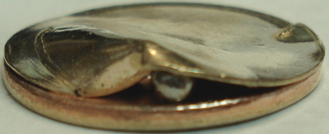 This is a unique discovery and first reported in Mint Error News. Recently a handful of planchets used to strike the Presidential Dollars were discovered in a bag from the U.S. Mint. In it were the following two mint errors, including a newly discovered mint error type. These two blanks were sent to NGC for authentication and certification. The first is a planchet with a defective clad layer. The other blank which is the newly discovered error type is a planchet with a burnishing ball wedged into the clad layer.
