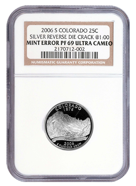 NGC recently identified die cracks on two issues of silver proof States Quarters. The first discovery was on a 2005-S Silver West Virginia Quarter, where a thin crack emerges from the rim at approximately 4:00 and enters the frosted devices. The second error, seen on a 2006-S Silver Colorado Quarter, is slightly more dramatic. It starts at the rim just past 1:00 and runs diagonally through the mirrored field, which makes it readily visible.